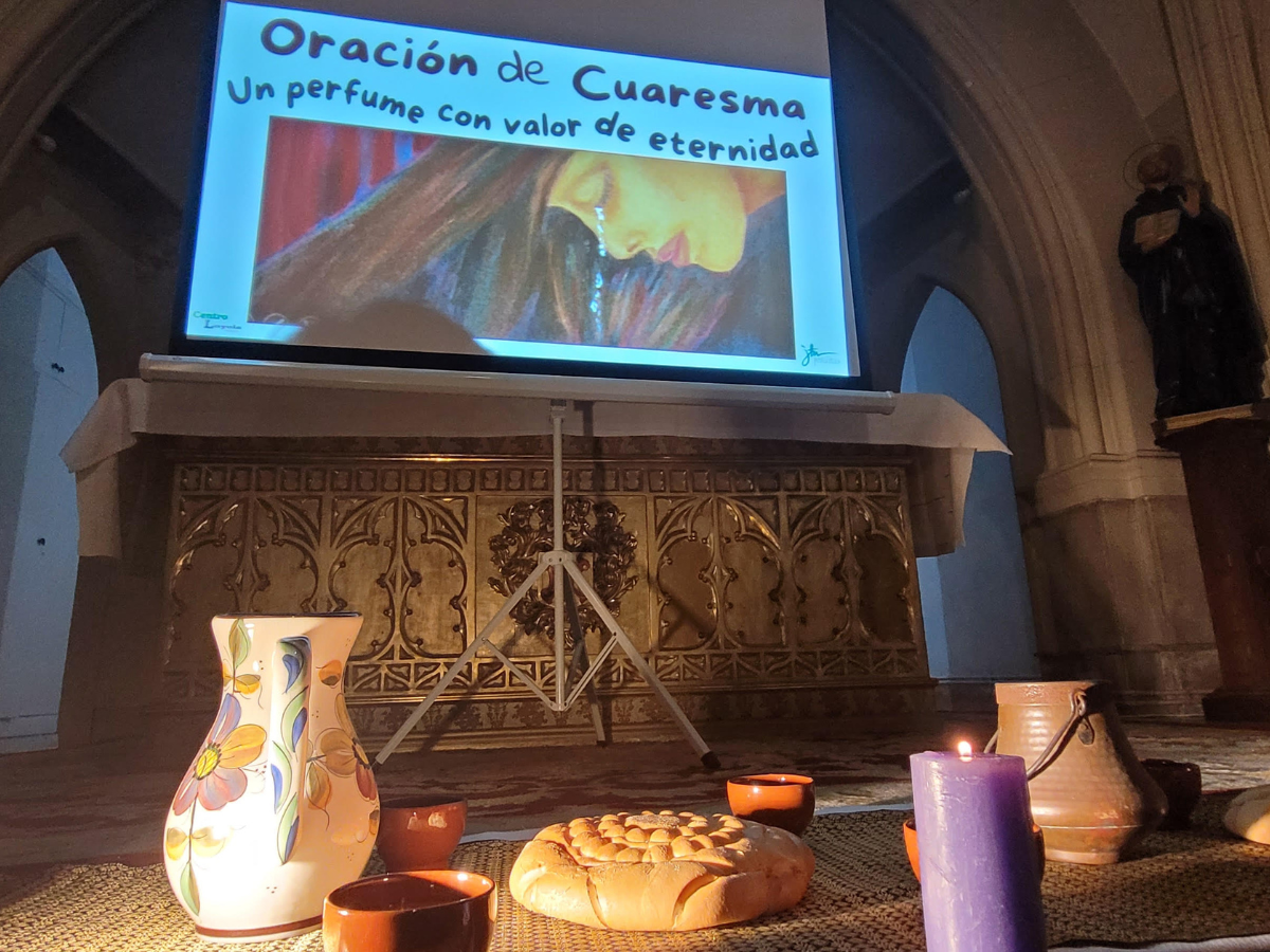 Como fondo de toda la Celebración oracional estaba el texto de la Cena, y el Gesto de María Magdalena con Jesús: “María tomó una libra de perfume de nardo, auténtico y costoso, le ungió a Jesús los pies y se los enjugó con su cabellera. Y la casa se llenó de la fragancia del perfume…" (Juan 12,1-8).