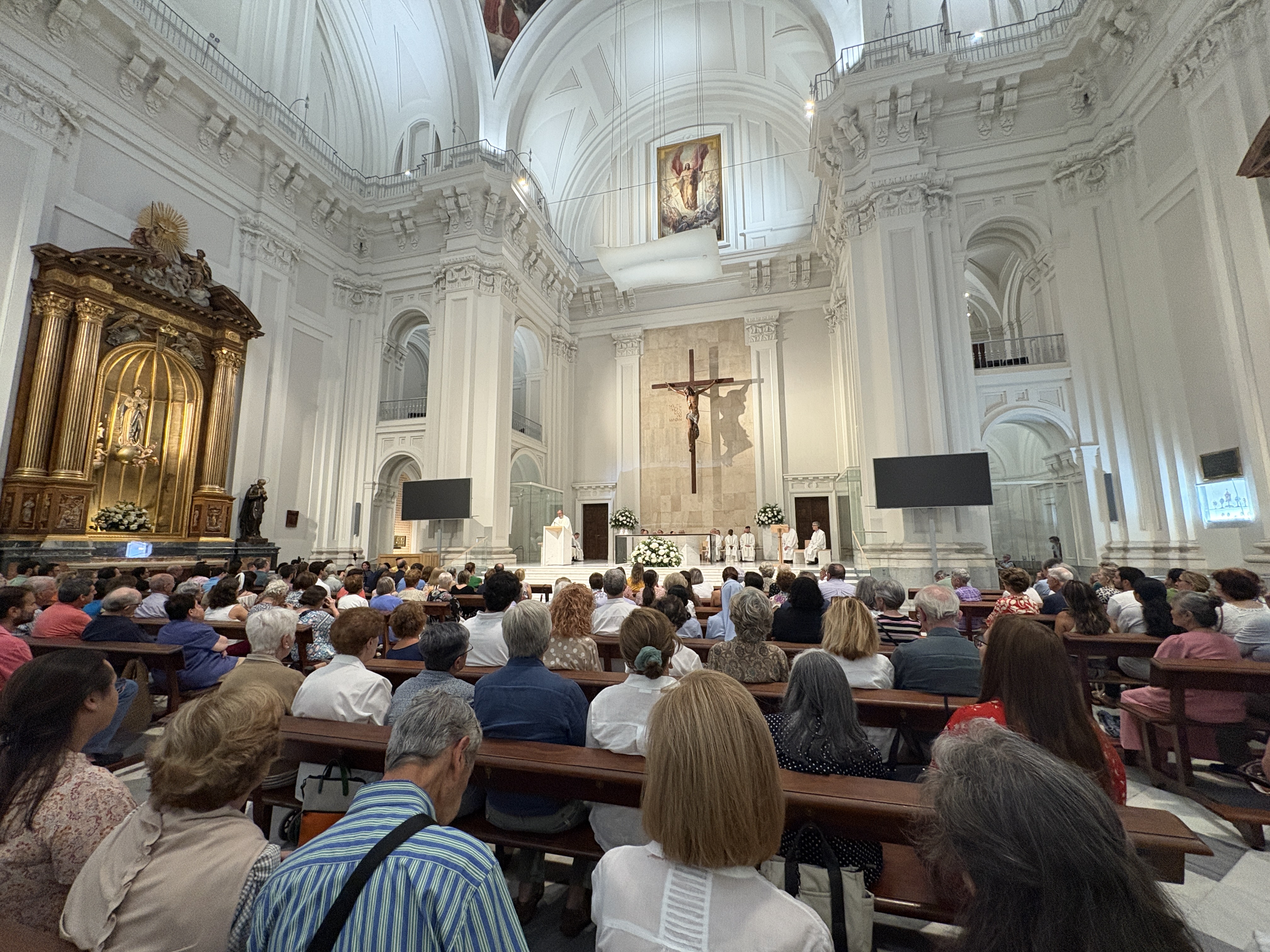 La celebración estuvo presidida por el P. Pablo Guerrero SJ y contó con la concelebración de una veintena de sacerdotes jesuitas. El templo, con sus mejores galas, acogió una misa marcada por la belleza del acompañamiento del coro ignaciano de la plataforma apostólica, cuyas voces elevaron el sentido y la oración de cada momento de la liturgia.