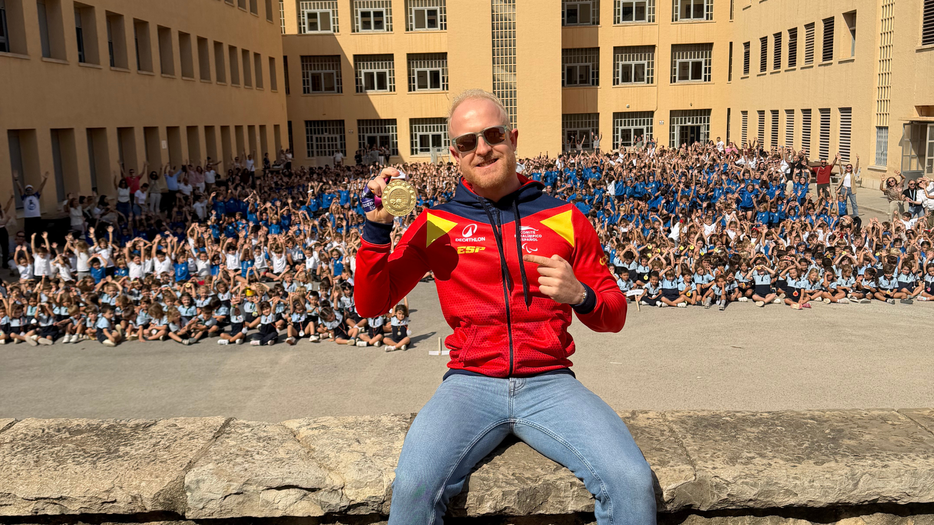 El patio del Colegio Inmaculada Jesuitas de Alicante acogió el miércoles 8 de octubre un acto de reconocimiento al profesor y campeón del mundo T13 de salto de longitud, Iván Cano Blanco.