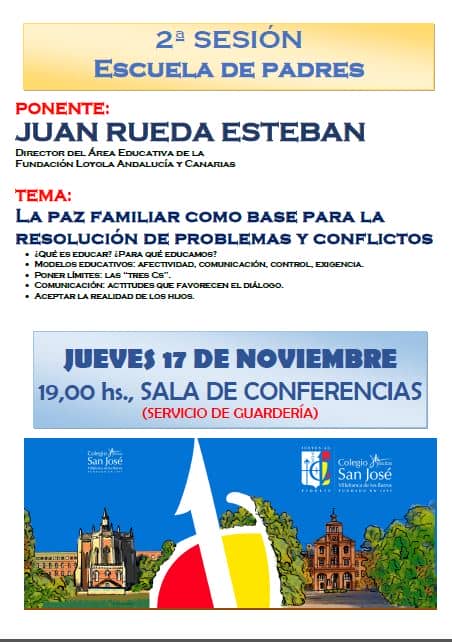 La Escuela de Padres del Colegio San José de Villafranca de los Barros (Badajoz) presenta su segunda sesión el próximo jueves 17 de noviembre. “La paz familiar como base para la resolución de problemas y conflictos” será el título genérico de esta sesión a la que se invita a las familias desde el convencimiento de su interés y por la presencia de un ponente que sabrá poner luz a estas cuestiones.D. Juan Rueda Esteban, Doctor en Ciencias de la Educación, Licenciado en Teología y Filosofía. Como director del Área Educativa de la Fundación Loyola Andalucía y Canarias, coordina el trabajo de cuatro colegios de la Compañía de Jesús.
