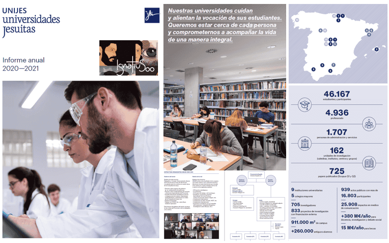 También se recoge en el informe la estructura organizativa de UNIJES, con dos ámbitos diferenciados, el gobierno del sector y la gestión de la red, con referencia a sus diversos órganos, las 4 comisiones y los 25 grupos de homólogos y de trabajo de la red; las 4 comisiones ; también se da cuenta del trabajo en las redes internacionales de universidades jesuitas de las que forman parte los centros de la red y, finalmente, se resumen los hechos más relevantes del curso 2020-21 de la variada actividad de la red UNIJES.