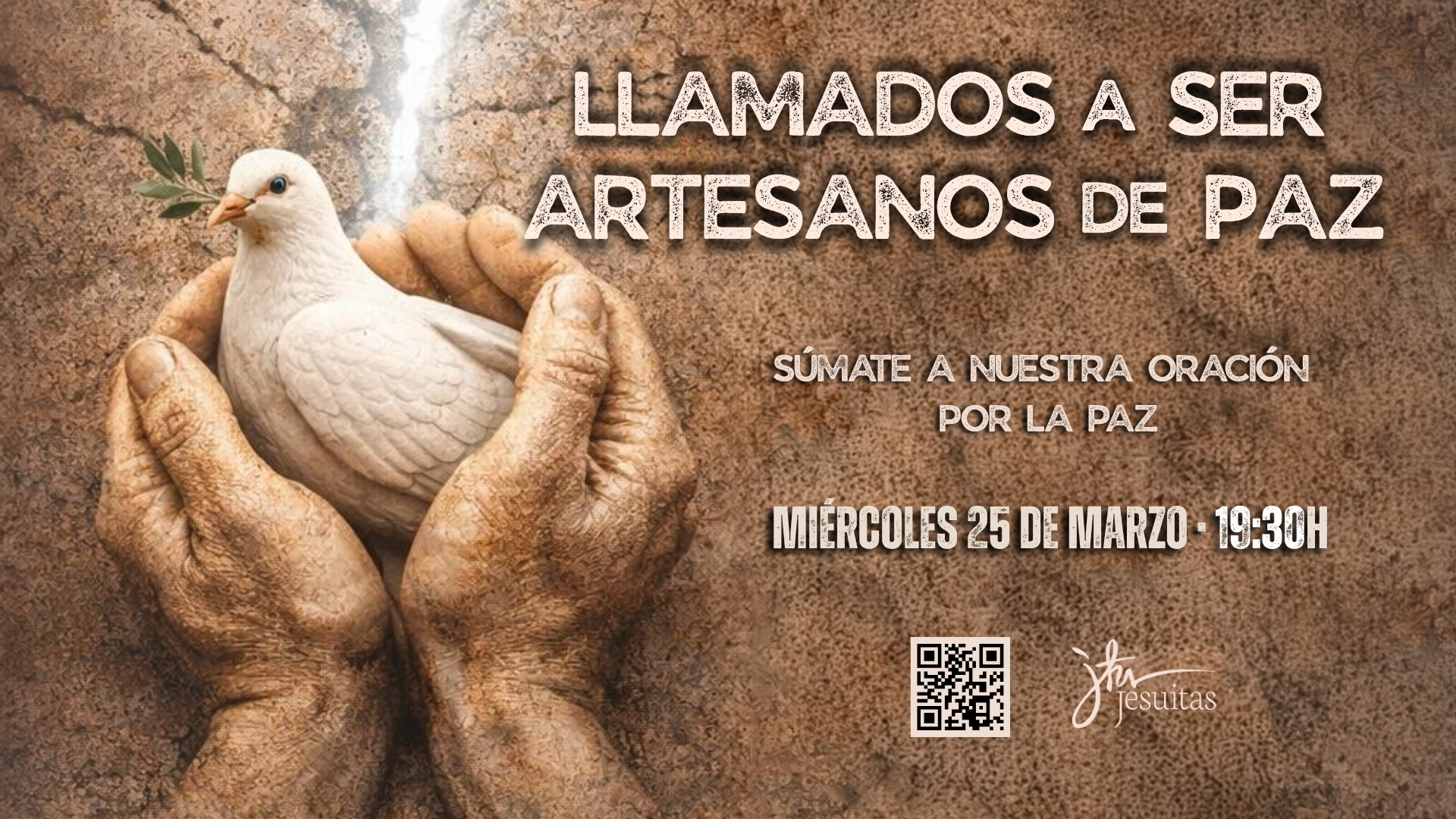 Desde la Compañía de Jesús nos queremos hacer eco de la invitación del Papa a rezar por la paz en este momento en el que se ve amenazada en tantos lugares de nuestro mundo. Os invitamos a participar en una oración online bajo el lema: Llamados a ser artesanos de paz. Será este próximo miércoles, 25 de marzo, a las 19:30 horas en este enlace.