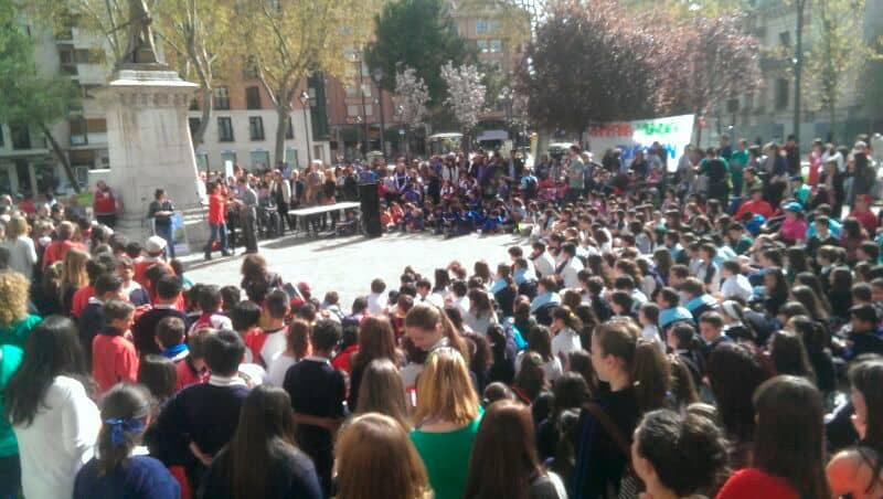 Los testimonios y la suma de capacidades de cientos de escolares de centros de Valladolid dieron todo el sentido al Aula en la calle y al lema que sustenta la Semana de Acción Mundial por la Educación (SAME) de este año: 'Sumemos capacidades. Por el derecho a una educación inclusiva'. Entreculturas de Valladolid organizó este gran acto en la calle con la colaboración de colectivos que trabajan por y para discapacitados físicos, sensoriales, psíquicos y enfermos mentales. Y gracias a este trabajo conjunto, la plaza sirvió de puente entre quienes se enfrentan día a día a sus limitaciones y quienes tienen el privilegio de una educación plena. Todos aprendieron de unos y otros: Alicia, madre de un niño con deficiencia auditiva; Miguel, estudiante universitario ciego; Víctor, presidente de Aspaym juventud; Santiago, profesor sordo de lenguaje de signos; Benjamín, estudiante de PCPI en Hostelería de FEAPS; Ana, niña sorda de 9 años; Esther, paralímpica de Pekín 2008 y muchos más, compartieron juntos, ante más de 700 niños de nueve colegios distintos su día y día. Pero también transmitieron lo que una buena educación les ha permitido alcanzar y conseguir para sí mismos. Luis Miguel, presidente de la Federación de Asociaciones de Personas Sordas, Álvaro, de Feafes El Puente y Arancha, socia de ONCE, leyeron el manifiesto que apuesta por que personas como ellas y otros 93 millones del mundo con discapacidad, una educación que les permita entrar en las aulas.
