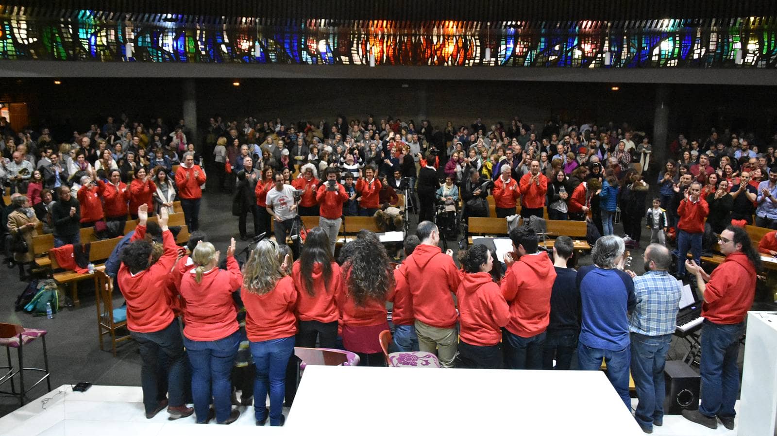 Encuentro, eucaristía, oración y concierto. El quinto aniversario de rezandovoy.org se celebró el pasado 5 de marzo durante la mañana en INEA, con unos 80 voluntarios, y por la tarde, con dos momentos abiertos al público en la iglesia de los jesuitas del Corazón de Jesús. Distintos tiempos y maneras de reconocer todo el sentido de esta historia compartida desde aquel 9 de marzo de 2011. La primera parte fue ese tiempo entrañable para quienes hacen que Rezandovoy siga prestando su servicio día a día. Fue el poner cara a muchos compañeros reconocidos por sus frutos y a la vez, desconocidos: el equipo de INEA, redactores, músicos, voces y colaboradores incondicionales en este proceso. Un encuentro relajado de bienvenida con un café; una reunión para intercambiar experiencias según las aportaciones de cada uno; y una ‘asamblea’ de todos para conocer de cerca el proceso (se emitió este vídeo de Vicente Aznar sj que refleja todo el proceso) y escuchar tomas falsas que Sinclair ha recopilado a lo largo de este tiempo. Muchas risas y mucha ilusión antes de la eucaristía: “Ser uno mismo y estar en los otros”, rezaba el poema que en la mañana y en la tarde estuvo presente para devolver ese sentido de que “Somos imagen del Dios de los encuentros”.