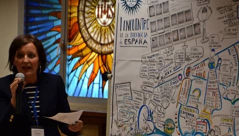 Luego ha girado el panel y los presentes han podido ver la imagen final de ese mural que hacía poco más de 24 horas era un simple papel blanco. Lo había llenado de luz, compromiso y color. El gráfico, como ha dicho “es denso, igual que el encuentro”. Lo ha ido recorriendo señalando pequeños flashes. En primer lugar “El somos”, es decir, las personas que han compartido el encuentro, que habitan “desde ese corazón del mundo, personas que son la luz, que intentan colaborar juntos, que somos… en comunidad”. En segundo lugar el “estamos llamados, invitados, convocados”, porque “hemos sido conmovidos”, y de ahí la imagen del corazón tan repetida estos cuatro días. En tercer lugar, el propio mural como una manera nueva de lenguaje, así como la música y la magia que hemos contemplado. Por útimo, también destacó del panel los testimonios de vida, la creatividad como nueva manera de estar en el mundo y la alegría y gozo que debemos poner en la misión.