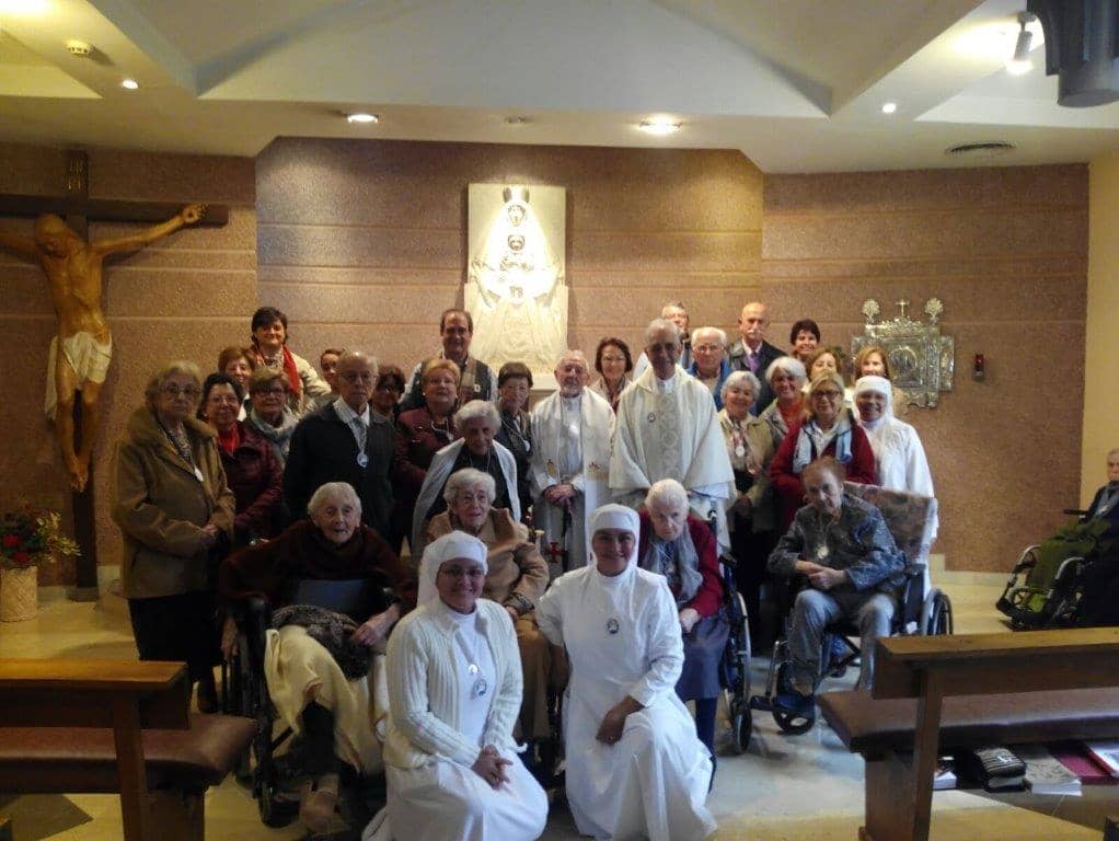 En la fotografía se puede ver un grupo de residentes, familiares, voluntarios y amigos junto a las hermanas y los capellanes.