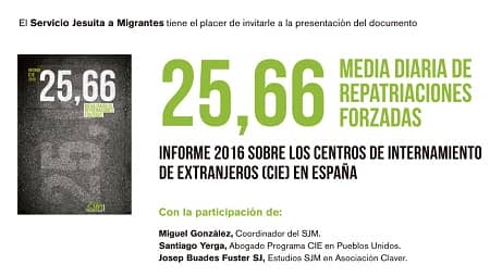 El próximo jueves 8 de junio el Servicio Jesuita a Migrantes (SJM) lanza el Informe Anual de 2016 sobre Centros de Internamiento de Extranjeros en España, que este año llevará por título "25,66: Media diaria de repatriaciones forzadas".