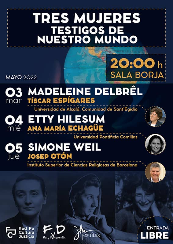 El Centro de Fe y Desarrollo celebra la próxima semana el ciclo Tres mujeres testigos de nuestro mundo dedicado a profundizar en los testimonios de vida de tres mujeres del siglo XX que afrontaron y asumieron valientemente las circunstancias complejas y dramáticas de su mundo: Madeleine Delbrêl (1904-1964), Etty Hillesum (1914-1943) y Simone Weill (1909-1943). Testimonios impactantes cuya opción ética o religiosa alimentó sus búsquedas del sentido del dolor, del mal, de las contradicciones o del absurdo. Los ponentes hacen memoria de sus vidas en un tiempo convulso, marcado por el rompimiento de muchas esperanzas, de muchos valores, de muchas creencias, por la incertidumbre del futuro y por el sufrimiento, sobre todo de los más pobres, los más vulnerables y de las víctimas del sistema y la violencia, con las debidas distancias y diferencias circunstanciales o culturales.