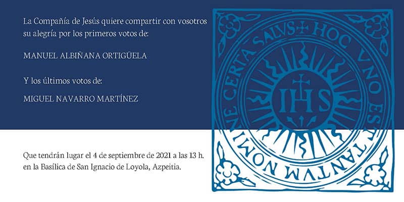 Nos alegramos de compartir el anuncio de los primeros votos del novicio Manuel Albiñana SJ y los últimos del H. Miguel Navarro SJ.