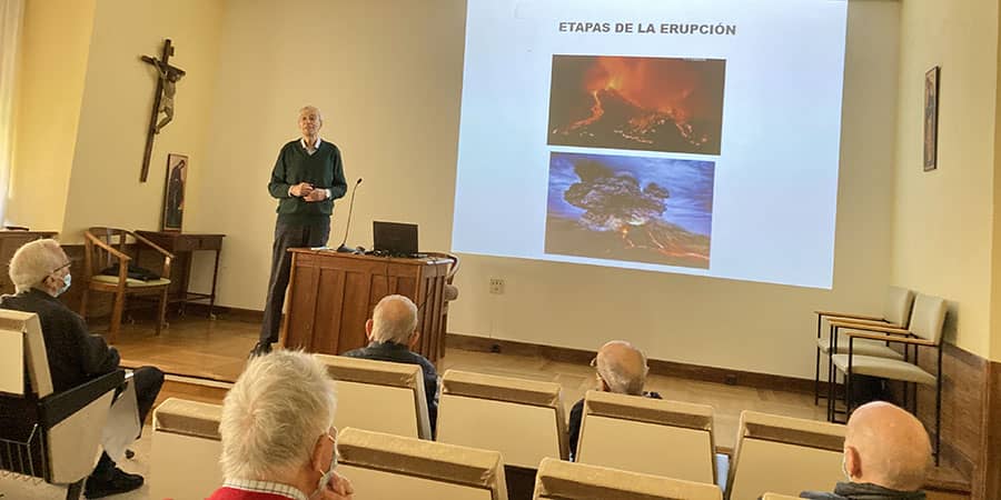 En la reunión de comunidad en Salamanca, el sábado 23 de octubre, Agustín Udías SJ, experto en geofísica y vulcanología, explicó a la comunidad las razones y consecuencias de la erupción del volcán Cumbre Vieja en la isla de La Palma. Udías recordó que la tierra – único planeta con nombre en femenino –, como sistema complejo y activo, es un ser vivo que desde su núcleo hasta su corteza está en un continuo cambio. Las cicatrices en la capa más externa de la tierra, creadas por los movimientos de las placas tectónicas, generan áreas de mayor actividad donde las placas se unen, dando lugar a zonas de mayor actividad sísmica y a fenómenos como los volcanes. España y sus territorios insulares está al borde de las placas que generaron los continentes de África y Eurasia. Por ello, existen zonas sísmicas y volcánicas de notable actividad.