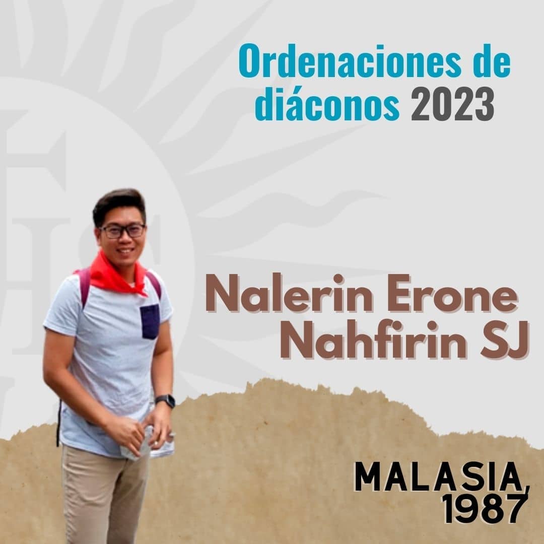Nalerin Erone nació en 1987 en Kota Kinabalu, Sabah (Malasia). Entró en la Compañía de Jesús en 2012 y ahora reside en la Comunidad del Teologado Sagrado Corazón de Jesús General Pintos (Madrid) y estudia Teología en la Universidad Pontificia de Comillas.