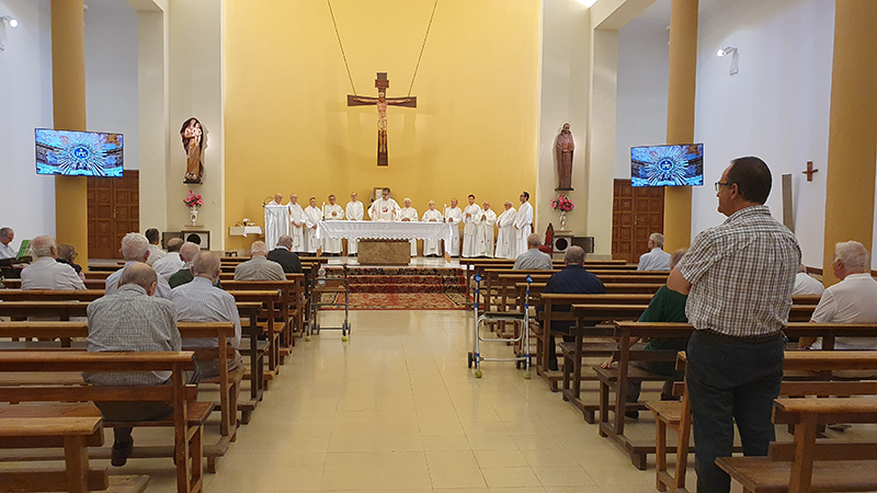 A las 12,30 del día 11 de septiembre se celebró una Eucaristía presidida por el P. Provincial, acompañado por el nuevo delegado de la Plataforma de Madrid (Gerar Villar) así como el Delegado saliente para la 3ª edad (Ramón Fresneda), el superior saliente de Alcalá (Rafael Mateos) y Pedro García Vera, que tomaba los cargos de superior de Alcalá y Delegado para la 3ª edad. En total, junto al P. Provincial (Enric Puiggròs) concelebraron 12 sacerdotes y participó de la Eucaristía toda la comunidad jesuita de Alcalá, algunos empleados y el director del Colegio San Ignacio.